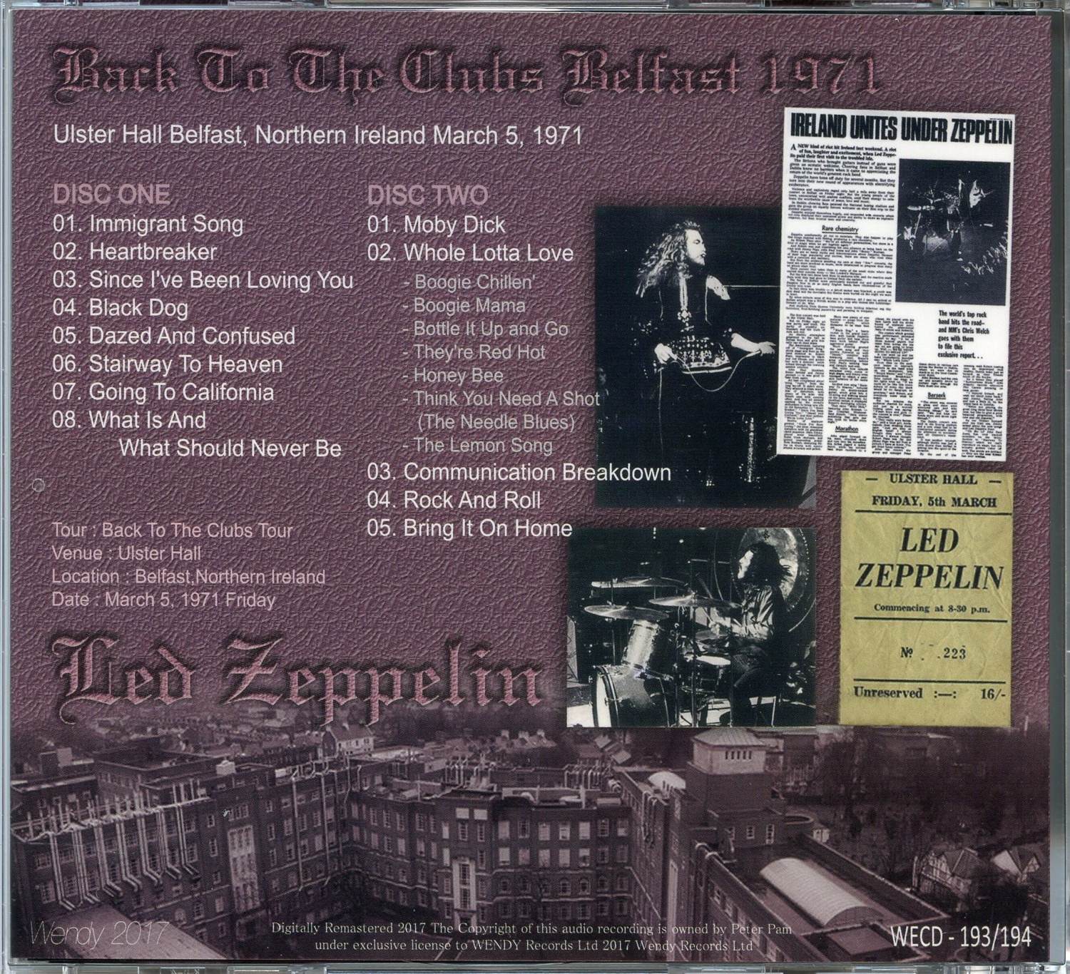 | Back To The Clubs Belfast 1971 ( 2 CD ) ( WENDY ) ( Ulster Hall Belfast, Northern Ireland, March 5th, 1971 ) | Picture | Tracks |