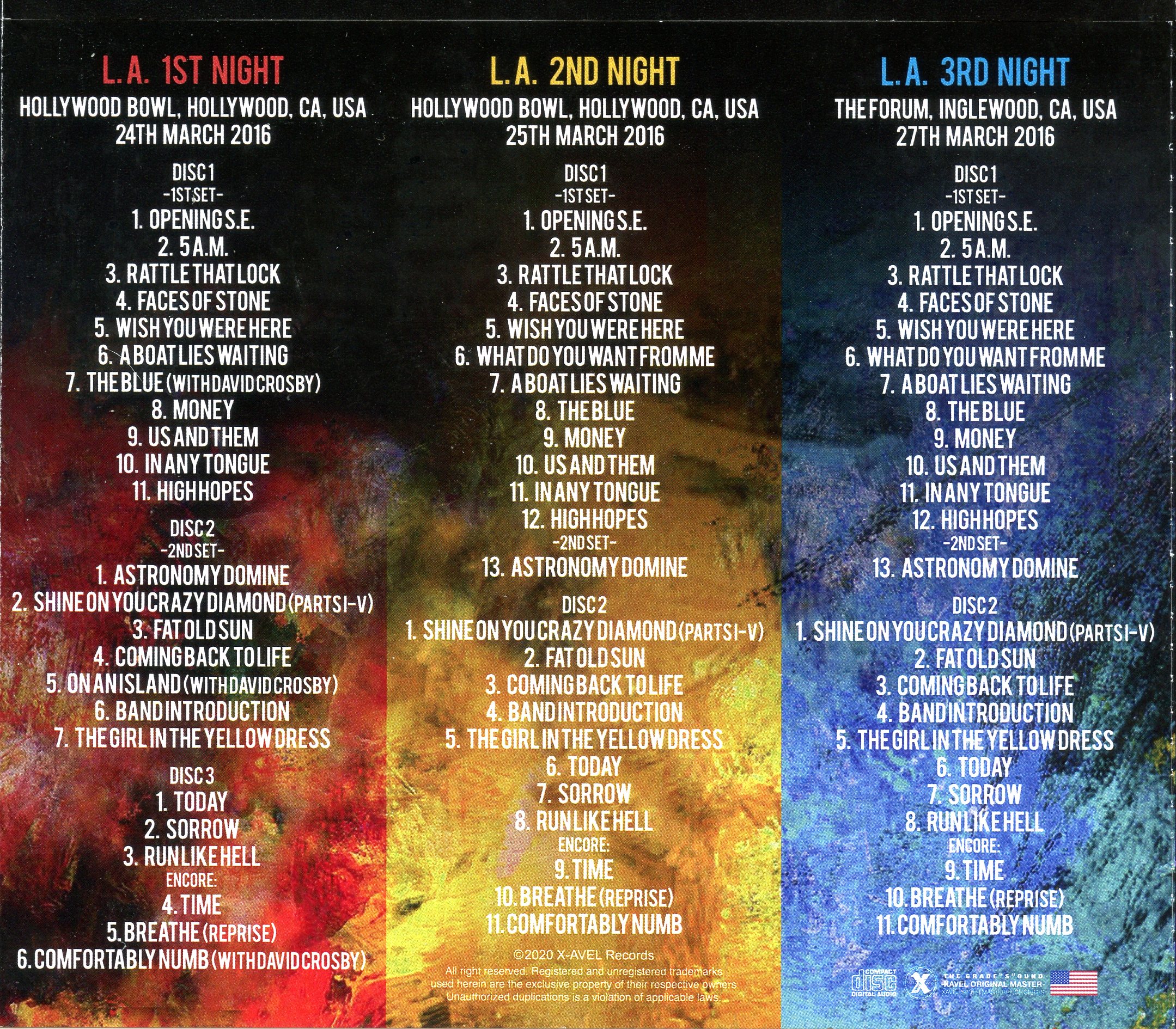 | 2016 LA 3 Days Complete ( 7 CD SET ) ( David Gilmour Live at Hollywood Bowl, Hollywood CA, USA, March 24th, 25th, 27th 2016 ) | Picture | Tracks |